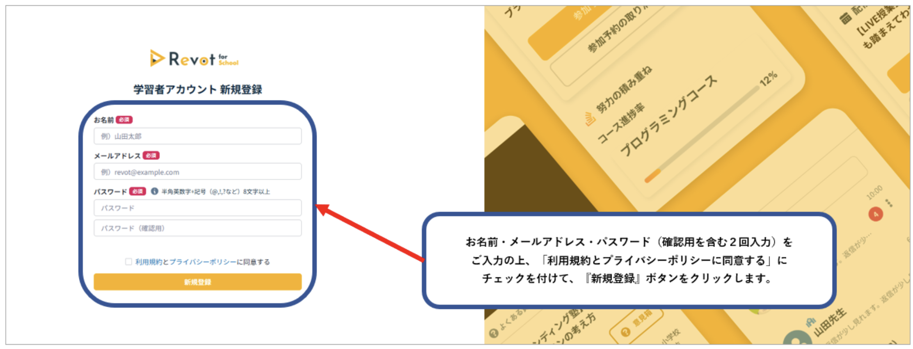 「学習者アカウント 新規登録」の画面にアクセスし、お名前、メールアドレス、パスワード(確認用を含め2回入力)をご入力の上、