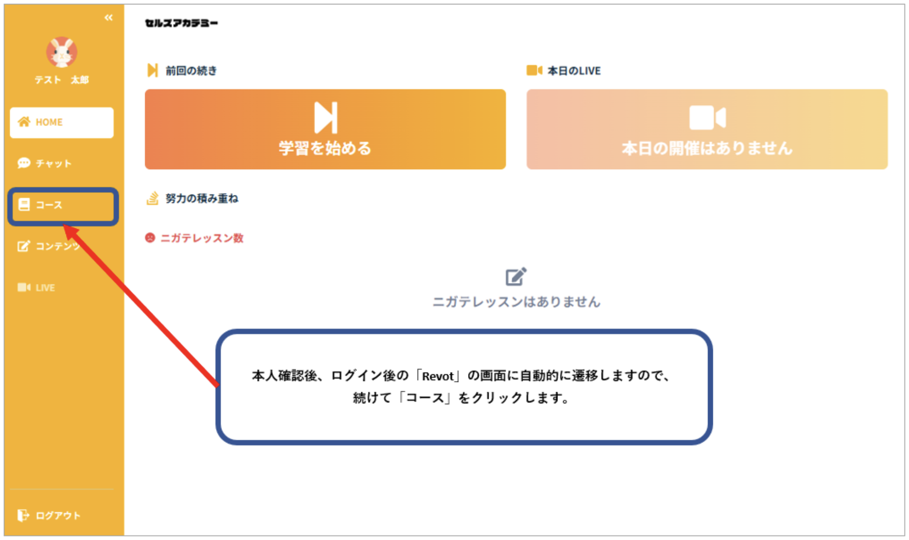 本人確認用のURLをクリック後、自動的にeラーニング「Revot」の画面が起動しますので、画面左側の「コース」をクリックします。