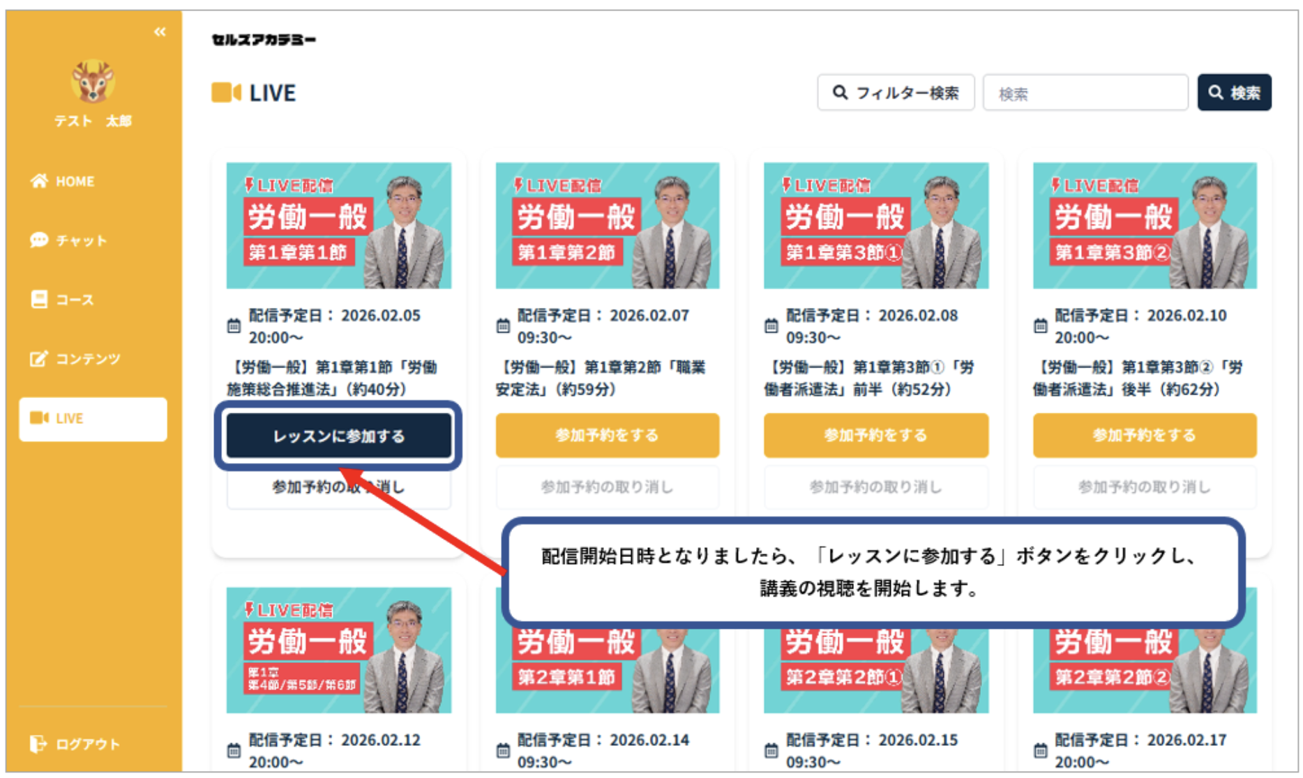 LIVE配信当日となりましたら、開始時間以降に「レッスンに参加する」ボタンをクリックし、講義動画をご視聴ください。