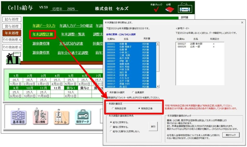 2025年の税制改正に対応し、令和7年分年末調整計算・帳票出力が可能となりました。さらに、令和8年分の源泉徴収税額表にも対応しており、年末調整計算と源泉徴収税額表は、改正前/改正後のどちらにも切り替えてご利用いただけます。
