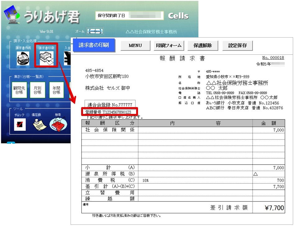 バージョンアップ後、新しく請求書を登録する前に、必ず「請求書印刷」ボタンより、登録番号が正しく表示されているかを確認してください。なお、「事務所情報」に登録番号が未登録の場合は、何も表示されません。